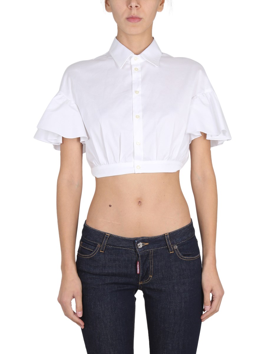 composizione- COLLETTO A PUNTA- CHIUSURA CON BOTTONI- MANICHE CON VOLANT- CROPPED- 97% COTONE, 3% ELASTAN- LA MODELLA È ALTA 180 CM E INDOSSA LA TAGLIA 40 IT