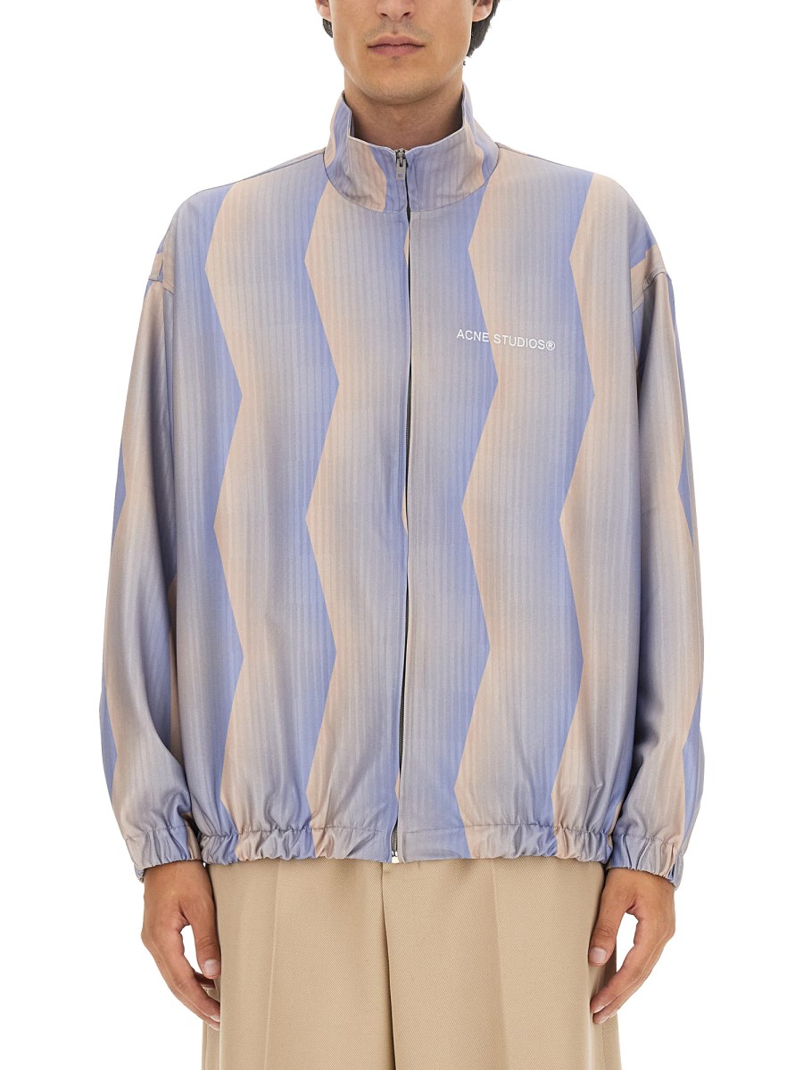 La giacca Acne Studios blu/beige presenta una stampa sublimatica all-over su jacquard, con ricamo del logo Acne Studios sul petto. Presenta una chiusura centrale con cerniera, tasche con cuciture laterali, polsini e orlo elasticizzati. Taglio rilassato e lunghezza sotto i fianchi.