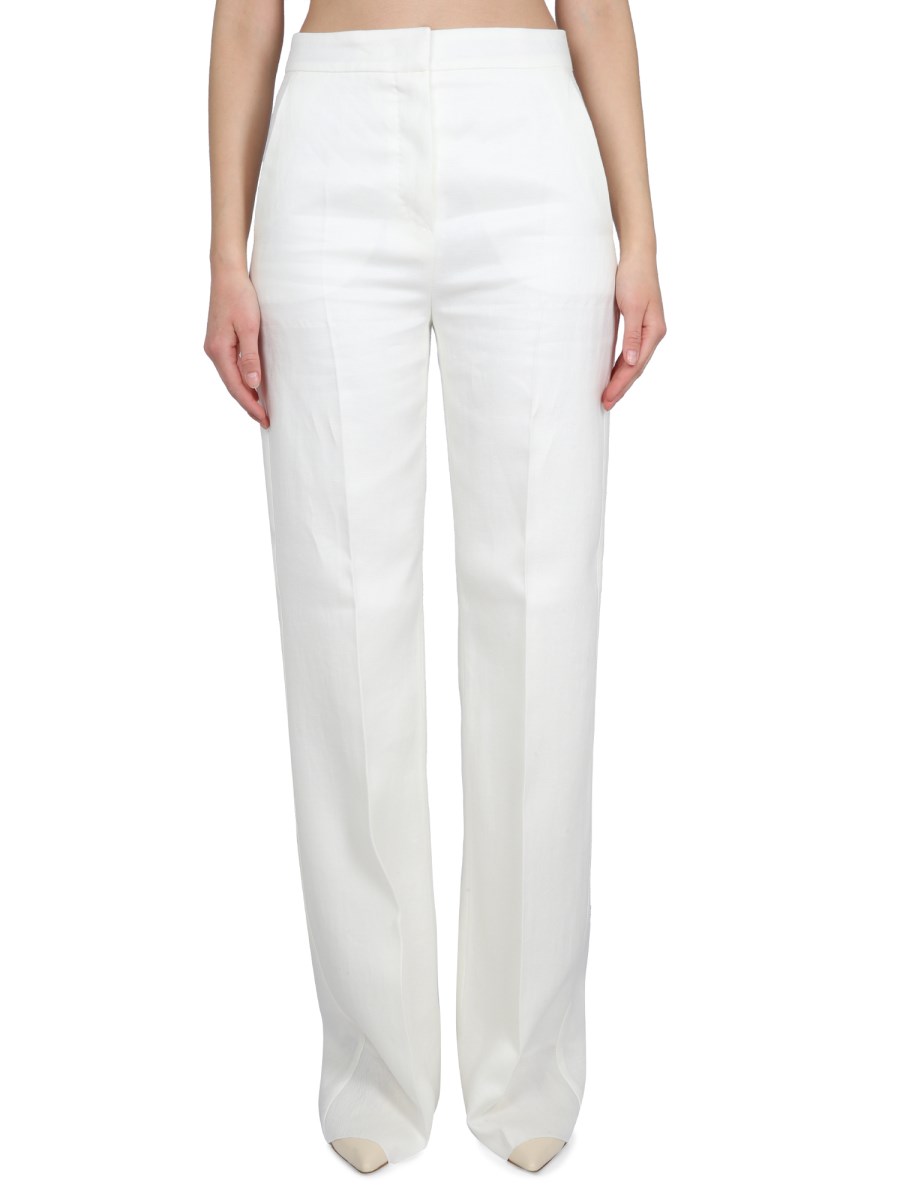 Pantaloni classici di ispirazione maschile, realizzati in tessuto twill di puro lino, con tasche oblique sui lati e piega a pantalone sulla gamba. Foderato. Chiusura con cintura alta in vita, patta con zip e piccolo gancio.