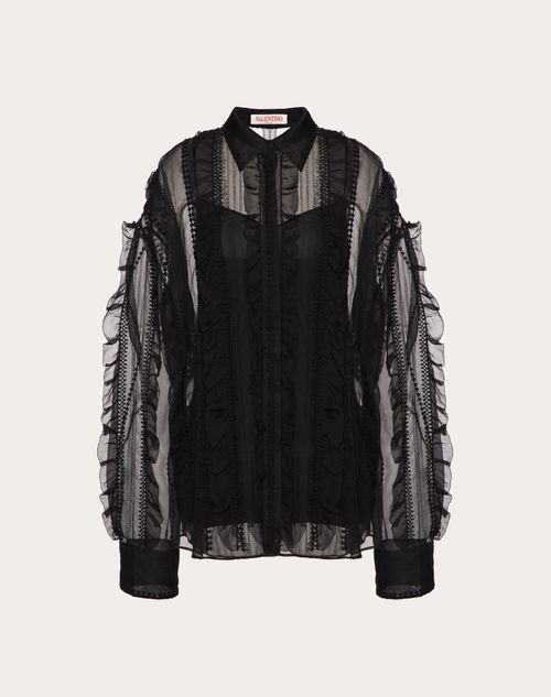 Camicia Valentino in Organza ricamata - Dettaglio rouches e ricamo all-over- Chiusura frontale con bottoncini nascosti - Organza (100%Seta) - Sfoderata - Lunghezza 75 cm da punto spalla per la taglia 40 IT - Lunghezza manica 87 cm da centro dietro per la taglia 40 IT - La modella è alta 176 cm e indossa una taglia 40 IT - Made in ItalyIl look è completato con una borsa Valentino Garavani Rockstud 23.