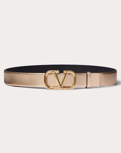 Cintura reversibile VLogo Signature Valentino Garavani in vitello metallizzato e vitello lucido. - Fibbia VLogo Signature finitura colore oro chiaro - Esterno in Vitello metallizzato - Interno in Vitello lucido - Dimensioni: H.30 mm - Made in Italy