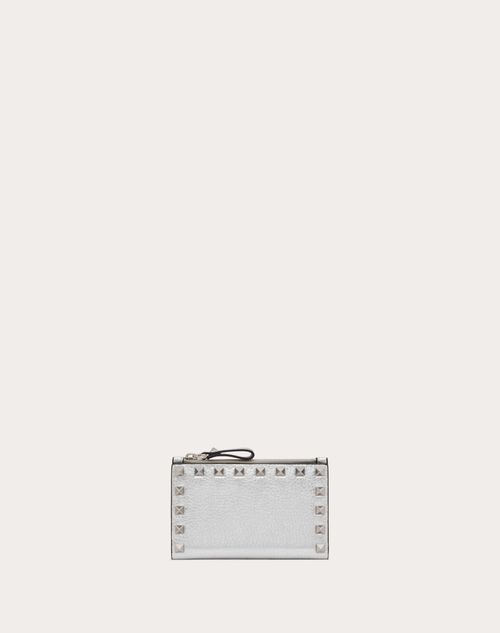 Portamonete e carte Rockstud Valentino Garavani in vitello granato metallizzato. - Borchie e parti metalliche finitura Palladio - Chiusura con bottone a pressione - Scomparto portamonete con chiusura a zip - Sei vani portacarte e due tasche piatte - Dimensioni: W13xH8xD1 cm - Made in Italy