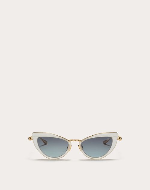 Frame VIII occhiale cat-eye in acetatoNata da un paesaggio onirico, intrisa di eleganza e inclusività, la nuova COLLEZIONE VALENTINO EYEWEAR riafferma la scelta di autenticità e la tradizione couture della Maison attraverso la maestria artigianale giapponese.CARATTERISTICHE- Montatura cat-eye in acetato bianco translucido a titanio con borchie 3D su ponte in titanio finitura oro.Aste logate con borchie pressate e vite superiore della cerniera a forma di stud. Tag RFID sull'estremità inferiore dell'asta sinistra.Naselli in ceramica con VLogo pressato.- Lente base 4 da grigio scuro a grigio chiaro, contrasto elevato CR-39. Categoria 3.- Protezione UV 100%.- Predisposizione per lenti graduate.- Occhiali da donna- Realizzati a mano in Giappone.PACKAGINGCustodia in pelle riciclata con tracolla e panno per la pulizia.DIMENSIONILunghezza aste: 14.2 cm / 5.5 inLarghezza totale occhiale: 13.5 cm / 5.3 inLarghezza lenti: 5 cm / 1.9 inAltezza lenti: 3.2 cm / 1.2 inPonte: 2 cm / 0.7 in