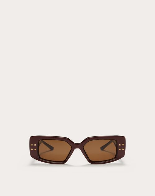 V - Occhiale da sole rettangolare in acetato.Nata da un paesaggio onirico, intrisa di eleganza e inclusività, la nuova COLLEZIONE VALENTINO EYEWEAR riafferma la scelta di autenticità e la tradizione couture della Maison attraverso la cura artigianale giapponese.CARATTERISTICHE - Robusto acetato giapponese scolpito di colore bordeaux con stud in oro.- Estremità delle aste lavorate sotto forma di stud in rilievo, rivetti in titanio con multistud (applicati a mano), cerniera su misura con vite superiore a forma di stud, decorazione multistud in titanio. - Tag RFID sull'estremità inferiore dell'asta sinistra.- Lente base 4 marrone scuro, contrasto elevato CR-39.- Protezione UV 100%.- Predisposizione per lenti graduate.- Occhiali da sole da donna.- Realizzato a mano in Giappone.PACKAGING- Custodia in pelle riciclata con tracolla e panno per la pulizia.DIMENSIONI- Lunghezza aste: 14,5 cm- Larghezza totale Occhiale da sole: 14,9 cm- Larghezza lenti: 5,3 cm- Altezza lenti: 3,5 cm- Ponte: 1,7 cm