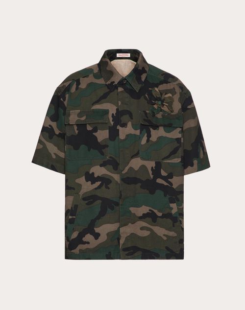 Camicia manica corta Valentino in cotone con stampa Camouflage e ricamo Camouflower- Regular fit- Stampa Camouflage all over- Ricamo Camouflower su tasca sul petto- Chiusura con bottoni- Due tasche sul petto- Due tasche laterali a filetto- Composizione: 100% Cotone- Lunghezza: 75 cm dall'attaccatura posteriore del collo in taglia 39 IT- Il modello è alto 187 cm e indossa una taglia 39 IT- Made in ItalyIl look è completato con scarpe Valentino Garavani True Act.