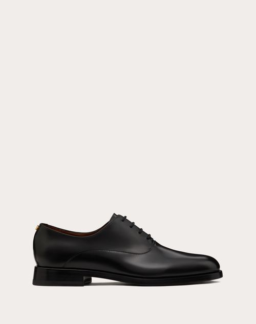 Derby Valentino Garavani Mini Vlogo Signature in vitello- Dettaglio Vlogo Signature finitura colore oro chiaro- Fondo gomma - Made in Italy