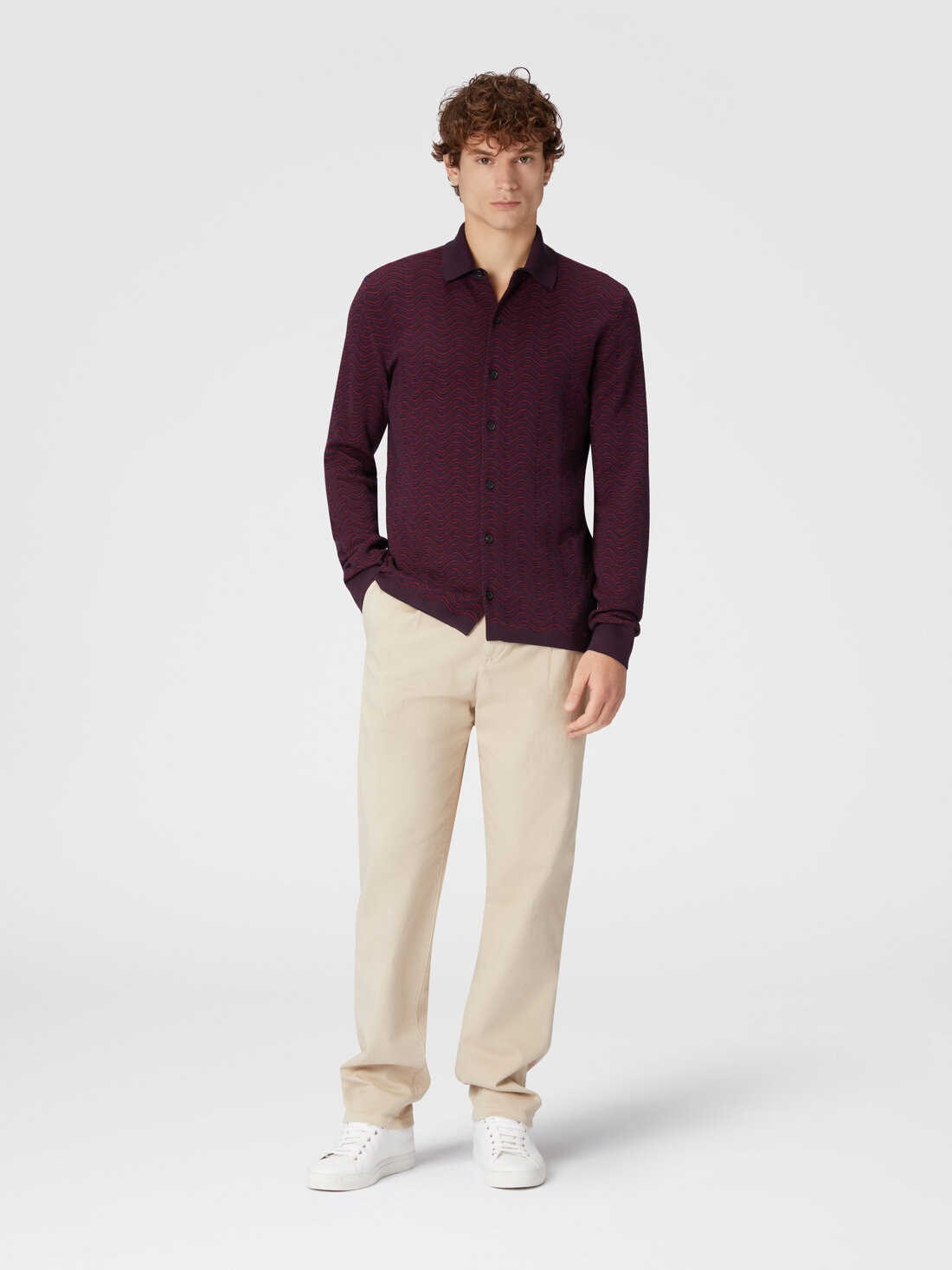 Un raffinato blend di lana e viscosa caratterizza la camicia in maglia operata. Impreziosito da una nuova icona di casa Missoni, il motivo onda dégradé, il capo è rifinito dai profili a costine e dai bottoncini personalizzati.