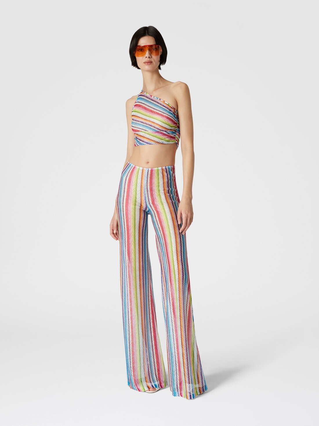 Giocano con le trasparenze del tessuto leggero, animato dalla lavorazione raschel con stampa zig zag verticale, i pantaloni copricostume. Caratterizzato dal taglio a vita bassa e leggermente svasato sul fondo, il capo è la quintessenza dello stile Missoni da spiaggia.
