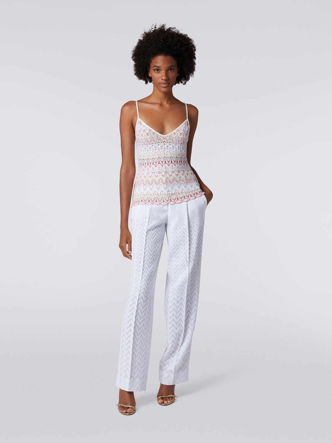 Due fini spalline e la profonda scollatura frontale a V, caratterizzano la raffinata canottiera da donna firmata Missoni. Realizzata in pregiato tessuto di misto viscosa, è istoriata dall'inconico motivo a onde effetto pizzo.
