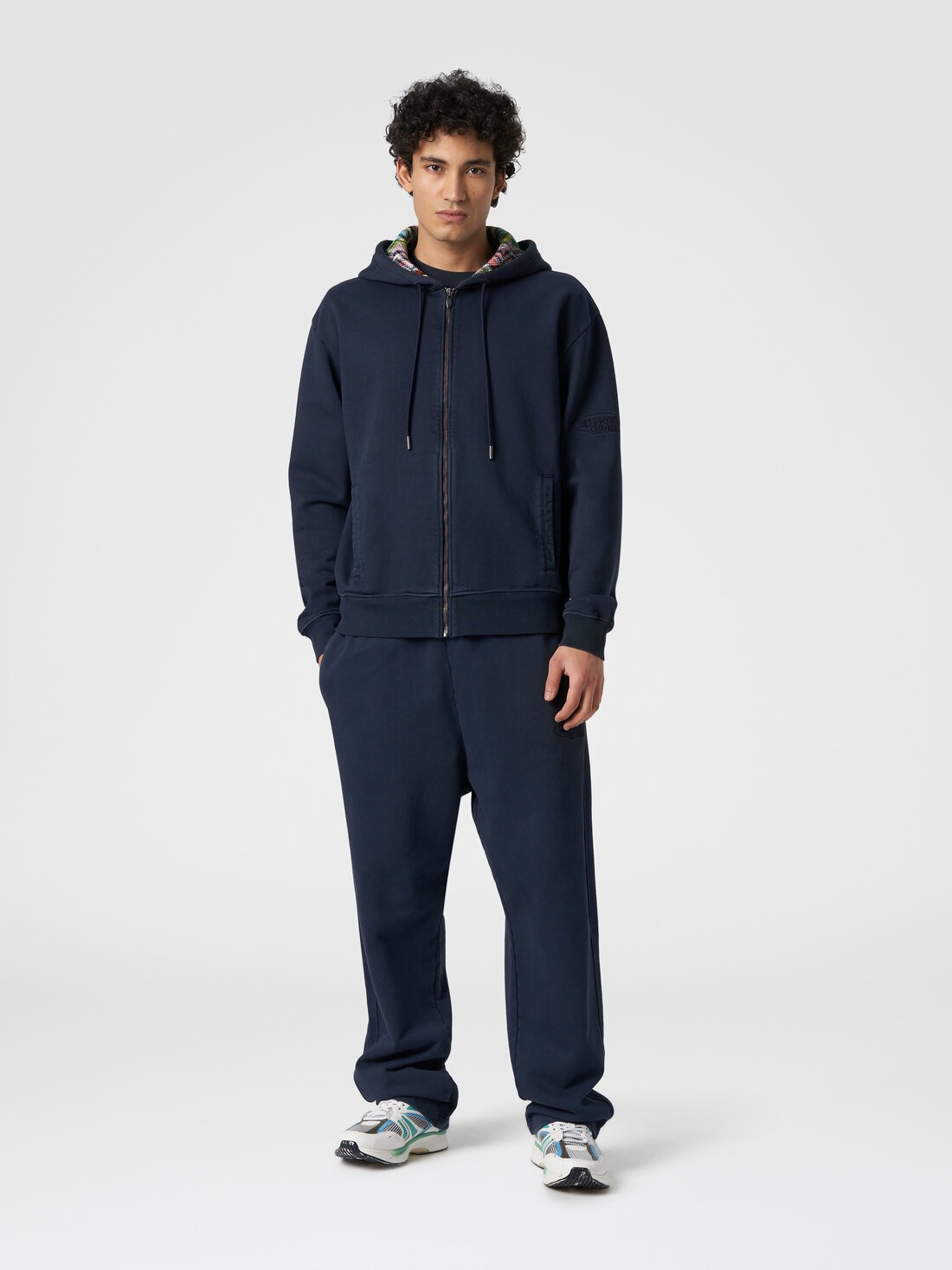 Il cardigan in felpa di cotone con cappuccio da uomo, caposaldo del casualwear, viene proposto da Missoni in una versione assolutamente inconfondibile. Merito della fodera in maglia con motivo caperdoni che fa capolino dal cappuccio, e dei dettagli personalizzati come la cerniera con logo e la scritta ricamata tono su tono. Completano il modello le pratiche tasche laterali.