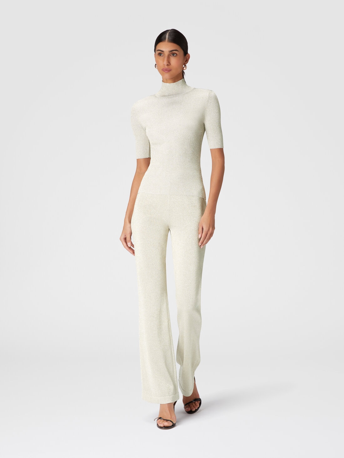 Il lupetto a maniche corte in maglia, modello intramontabile alla base degli outfit più disparati, acquisisce, grazie al tocco Missoni, un côte prezioso: merito del filato di viscosa acceso dal lamé.