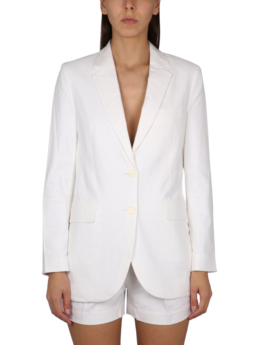 - REVERSE A DENTE- CHIUSURA CON BOTTONI- MONOPETTO- 54% LINO, 46% VISCOSA- LA MODELLA È ALTA 180 CM E INDOSSA LA TAGLIA 2