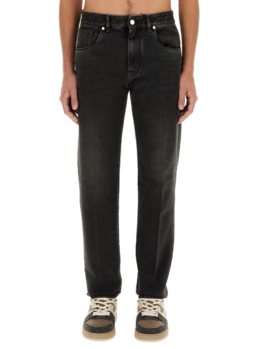 Pantaloni 5 tasche dal taglio dritto. Impreziositi da rivetti e bottoni di marca. Chiusura con zip nascosta. Realizzati in denim di cotone nero lavato. Impreziositi dall'etichetta Fendi in pelle nera sul retro.
