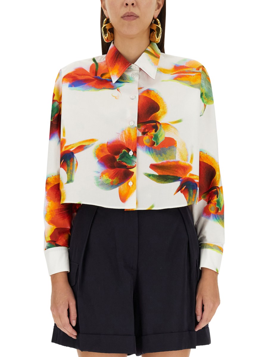 - CHIUSURA FRONTALE CON BOTTONI- COLLETTO CLASSICO- STAMPA SOLARISED ORCHID ALL OVER- CROPPED FIT - 100% COTONE - MADE IN ITALY- LA MODELLA È ALTA 180 CM E INDOSSA LA TAGLIA 40 IT