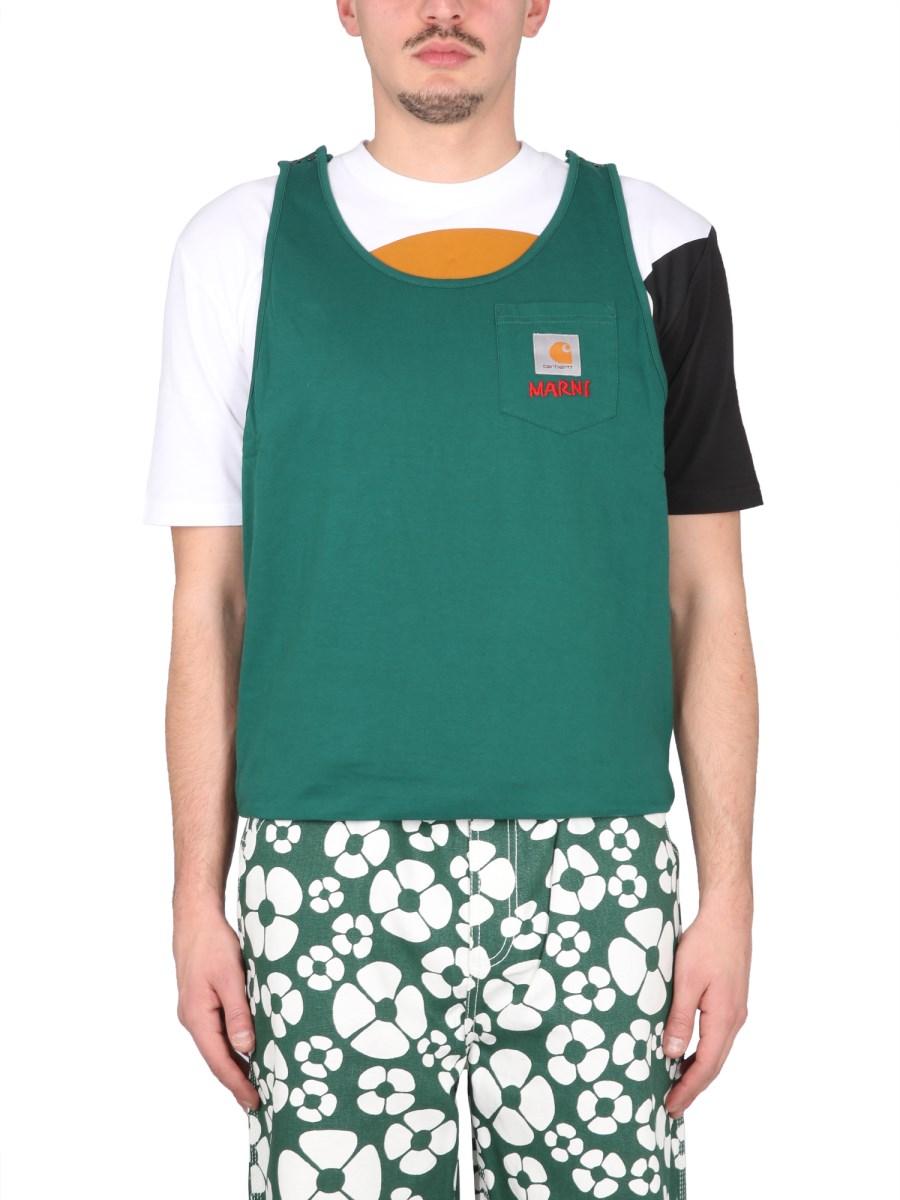 composizione- GIROCOLLO- MAXI LOGO CARHARTT WORK IN PROGRESS COLOR BLOCK- CANOTTA A CONTRASTO DA INDOSSARE SOPRA LA T-SHIRT O LASCIATA APPESA- ETICHETTA CARHARTT WORK IN PROGRESS SUL TASCHINO- LOGO MARNI SULLA MANICA- 100% COTONE- IL MODELLO È ALTO 190 CM E INDOSSA TAGLIA S