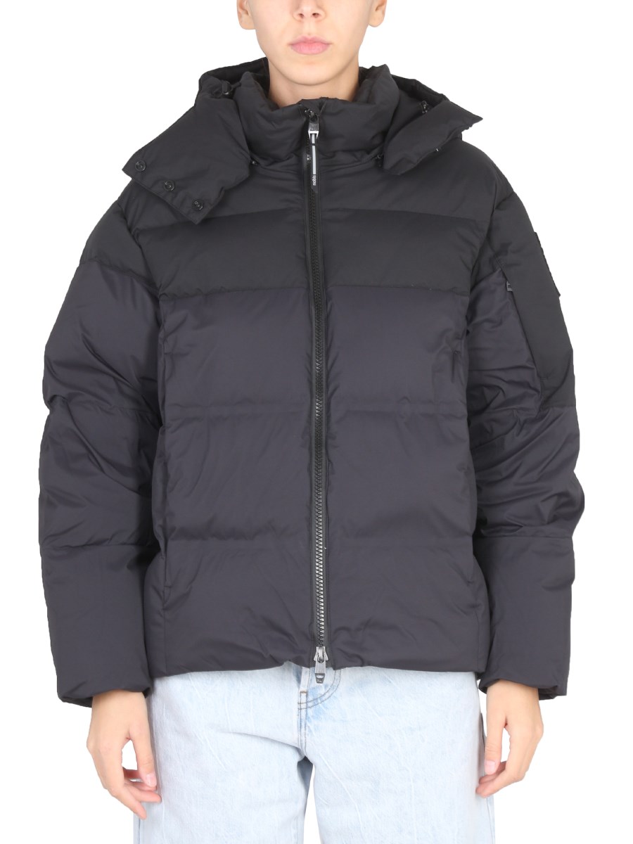 composizione- CAPPUCCIO CON COULISSE- CHIUSURA FRONTALE CON ZIP- DUE TASCHE LATERALI- PATCH LOGO- 100% NYLON- IL MODELLO È ALTO 185 CM E INDOSSA LA TAGLIA M