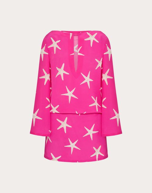 Abito Corto In Crepe De Chine Starfish - Scollo kaftano - Crepe De Chine Starfish (100%Seta) - Sfoderato - Lunghezza 85 cm da punto spalla per la taglia 40 IT - Lunghezza manica 80 cm da centro dietro per la taglia 40 IT - La modella è alta 176 cm e indossa una taglia 40 IT - Made in ItalyIl look è completato con scarpe Valentino Garavani Escape Collection 2024.