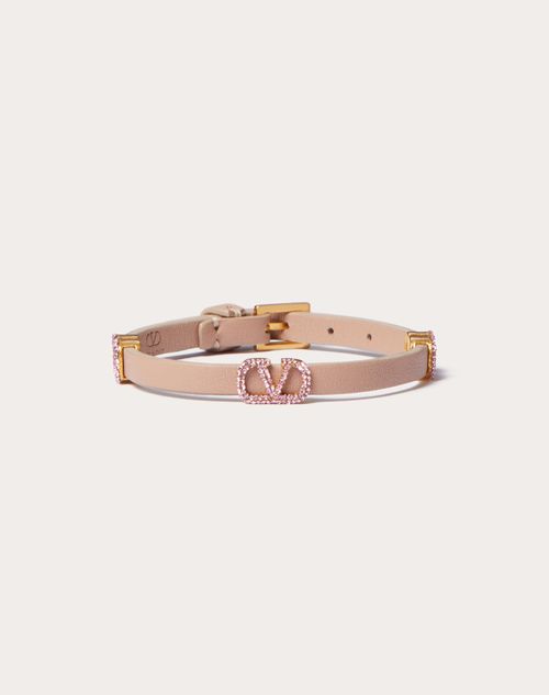 Bracciale VLogo Signature Valentino Garavani in vitello e cristalli- Logo in finitura antique brass- Cinturino regolabile- Lunghezza: regolabile da 16,6 cm a 19,3 cm - Altezza: 0,5 cm - Made in Italy