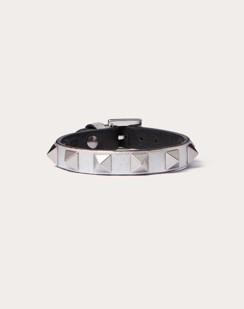 Bracciale Rockstud Valentino Garavani in pelle e metallo - Borchie in finitura palladio - Lunghezza: regolabile da 17,6 a 20,3 cm - Altezza: 1 cm - Dimensioni borchie: 8x8 mm - Chiusura con fibbia - Made in Italy