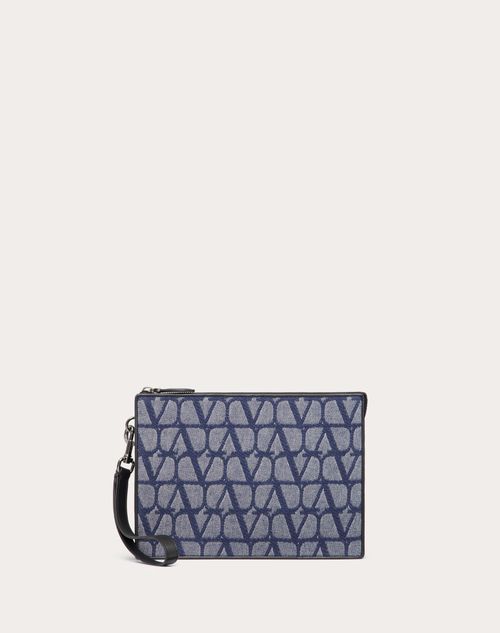 Pouch Toile Iconographe Valentino Garavani in tessuto jacquard Toile Iconographe effetto denim con dettagli in pelle.- Dettagli in pelle di vitello- Parti metalliche finitura rutenio- Chiusura con zip- Interno: sei scomparti per carte e una tasca piatta a parete- Manigliotto removibile in pelle- Logo Valentino Garavani- Dimensioni: W24,5 x H18 x D6 cm- Made in Italy