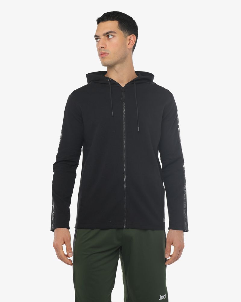 DESCRIZIONE: Felpa con zip e cappuccio, nastro personalizzato JKD sulle spalle. CARATTERISTICHE E VANTAGGI: -COMFORT: vestibilità regular, il capo protegge senza appesantire -INNOVAZIONE: taschine laterali e ampio cappuccio, nastro con stampa tono su tono -INTERESSE: capo trasversale, abbinabile a tutta la collezione SS20 -PLUS: facile manutenzione, lavabile in lavatrice.