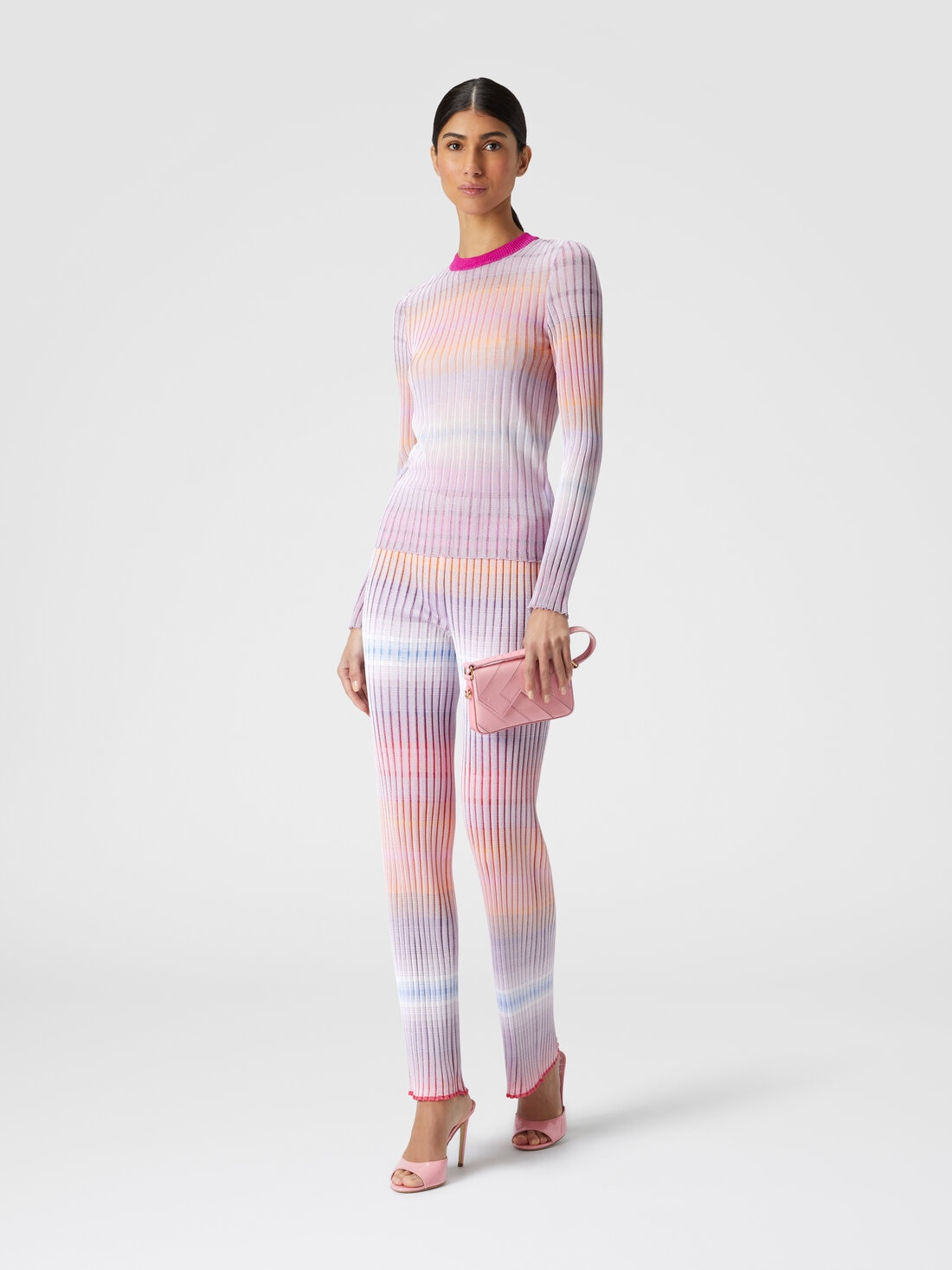 Manifestazione di raffinatezza e stile, i pantaloni dritti da donna in pura viscosa a coste rappresentano un'elegante dichiarazione di moda. Caratterizzati dalla sofisticata lavorazione vanisé e dall'elastico in vita a contrasto, i pantaloni sono il perfetto conubio tra attenzione ai dettagli e inovazione, riflettendo il distintivo stile Missoni.
