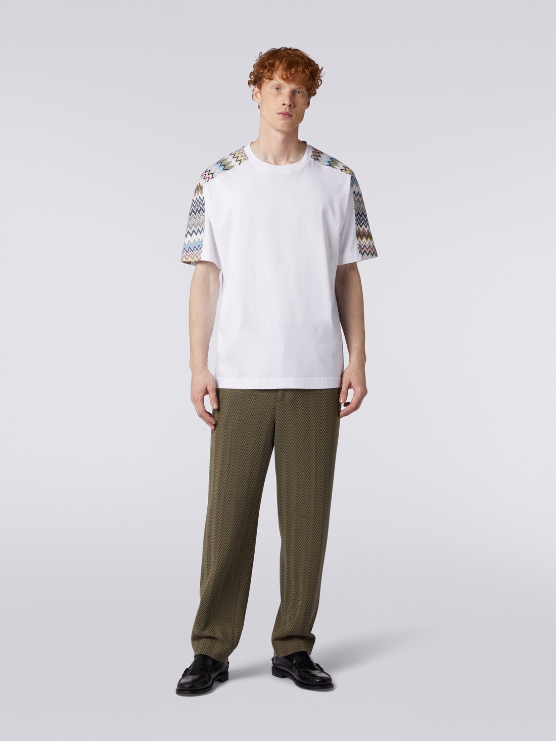 Anche quando si cimenta nella creazione di pezzi basic, associati all'abbigliamento casual, il gusto di Missoni per un savoir-faire di lusso prorompe in tutta la sua forza. Prova ne è la t-shirt da uomo a maniche corte in jersey cotone, caratterizzata da inserti chevron che bandiscono subito ogni forma di monotonia.