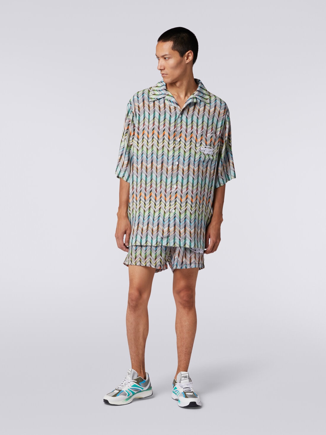 La raffinatezza della viscosa con stampa caperdoni incontra il casual style della camicia da bowling nel modello da uomo a maniche corte. Arricchito dal taschino con scritta logo ricamata, questo capo è la più chiara rappresentazione del DNA Missoni in formato daily wear.